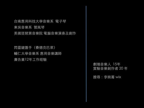 閃靈鍵盤⼿(賽德克巴萊) 輔仁⼤學⾳樂系 應⽤⾳樂講師 廣告業12年⼯作經驗 劇場⾳樂⼈ 15年 實驗⾳樂創作者 20 年 搜尋:李婉菁 wix