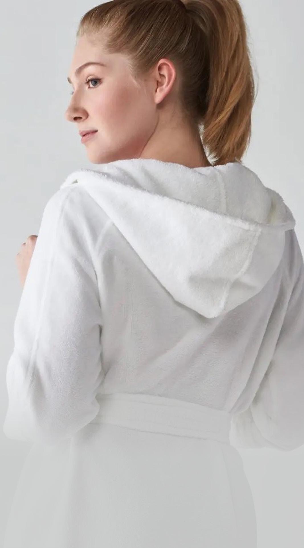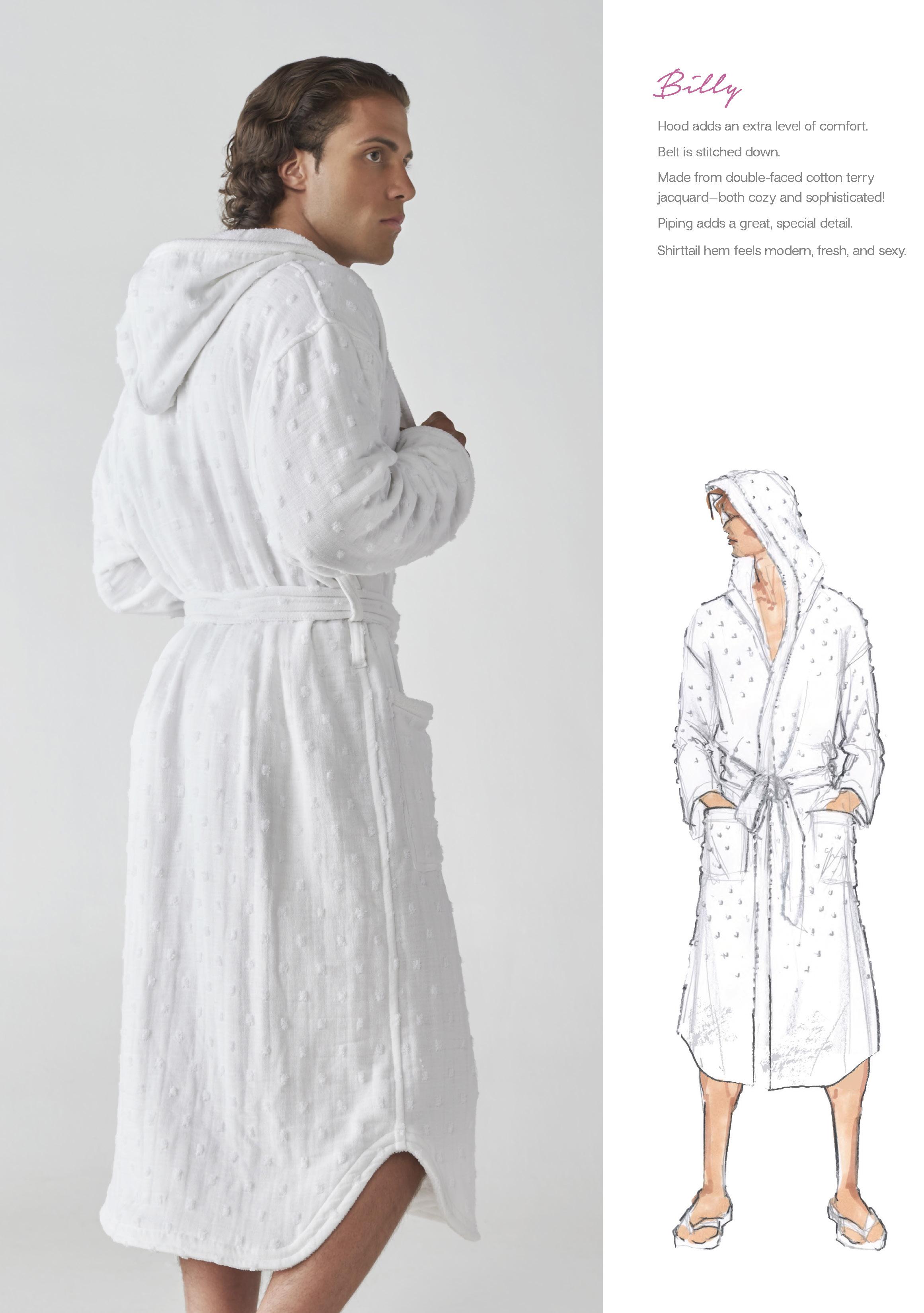 The Billy Robe attached hood adds an extra level of comfort. Made from double-faced cotton terry jacquard—both cozy and sophisticated! Piping adds a great, special detail. Shirttail hem feels modern, fresh, and sexy.