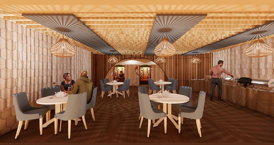 The Café is a meticulously designed, intimate space crafted with functionality and spatial efficiency in mind. With a capacity to comfortably accommodate 4050 patrons, it offers a vibrant and inviting atmosphere for guests to unwind and socialize. The incorporation of skylights infuses the interior with natural light, creating a warm and welcoming ambiance that enhances the dining experience. Complementing this, a green roof not only adds visual appeal but also contributes to the café's sustainability efforts.