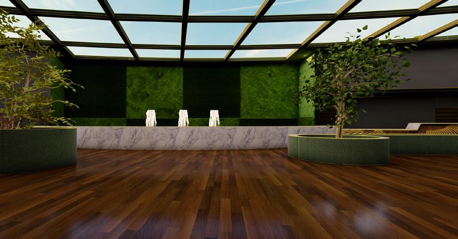 The Administrative Building is a meticulously designed single-story space with a doubleheight layout, featuring a central courtyard flooding the building with natural light and water elements. This layout optimizes functionality and user experience, facilitating efficient circulation. The integration of the courtyard blurs indoor-outdoor boundaries, fostering openness and connectivity. Landscapes and green spaces within enhance aesthetics and air quality, promoting biophilic design principles.