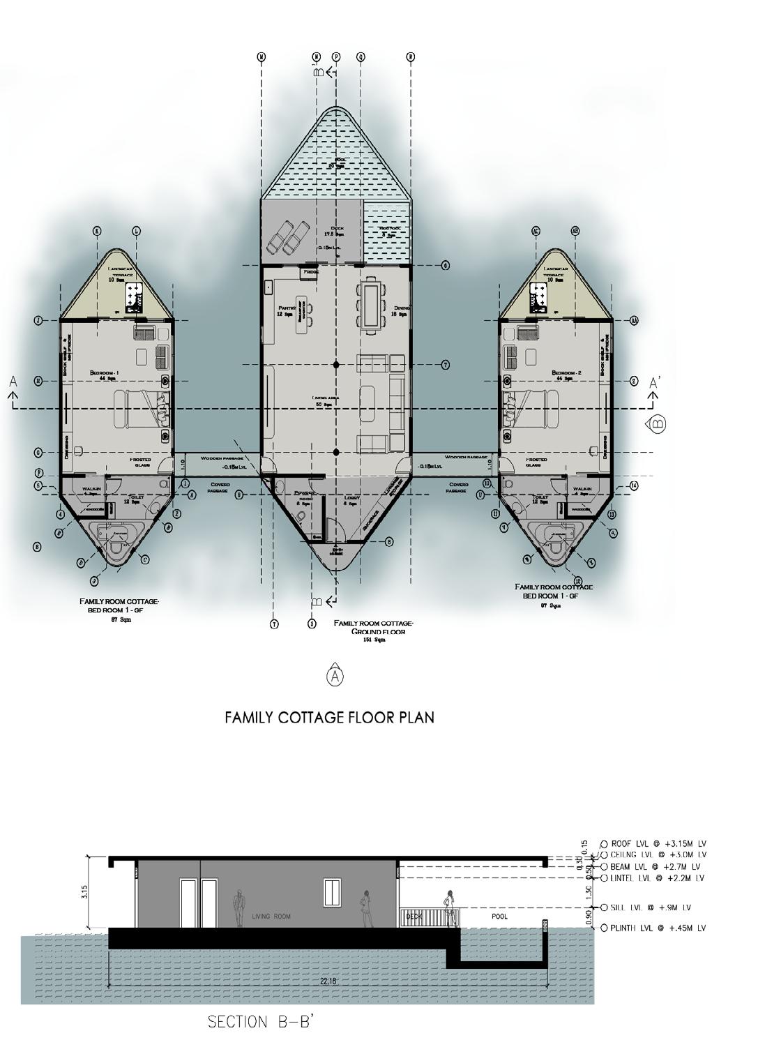 The Family Cottages are meticulously designed to cater to the needs of a family of two, offering a harmonious blend of functionality and spatial design. Each cottage features two wellappointed bedrooms, ensuring privacy and comfort for all occupants. A spacious living room serves as the heart of the home, providing a welcoming space for relaxation and socializing.