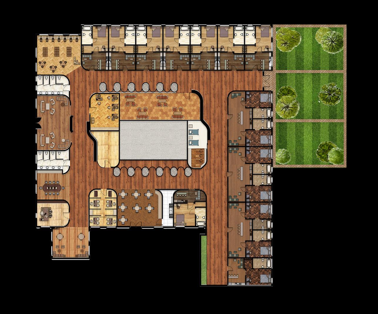 The Spa is envisioned as a cohesive unit with an open courtyard as its focal point, facilitating relaxation and connection with nature. Surrounded by lush greenery, both indoors and outdoors, it offers serene views of the lake. Functionally, it offers a variety of guest services while also serving as a draw for visitors and tourists seeking rejuvenation and tranquility.