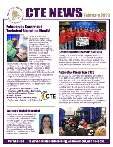 Welcome Rachel Rosenthal Rachel is the newest member of the CTE team! Rachel is Administrative Assistant to the Coordinators and she provides support to CTE, Athletics, Art, Music, Physical Education, and the School Forest. Rachel has extensive experience as an Operations Manager for Roundy’s and she is a proud mother of three children. Welcome Rachel!