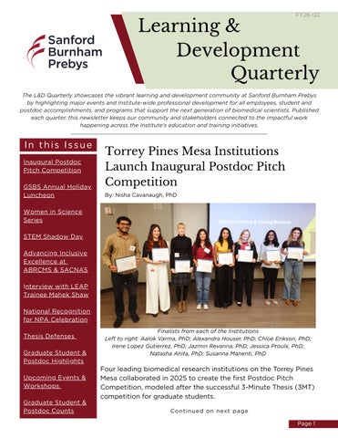 The L&D Quarterly showcases the vibrant learning and development community at Sanford Burnham Prebys by highlighting major events and Institute-wide professional development for all employees, student and postdoc accomplishments, and programs that support the next generation of biomedical scientists Published each quarter, this newsletter keeps our community and stakeholders connected to the impactful work happening across the Institute's education and training initiatives.