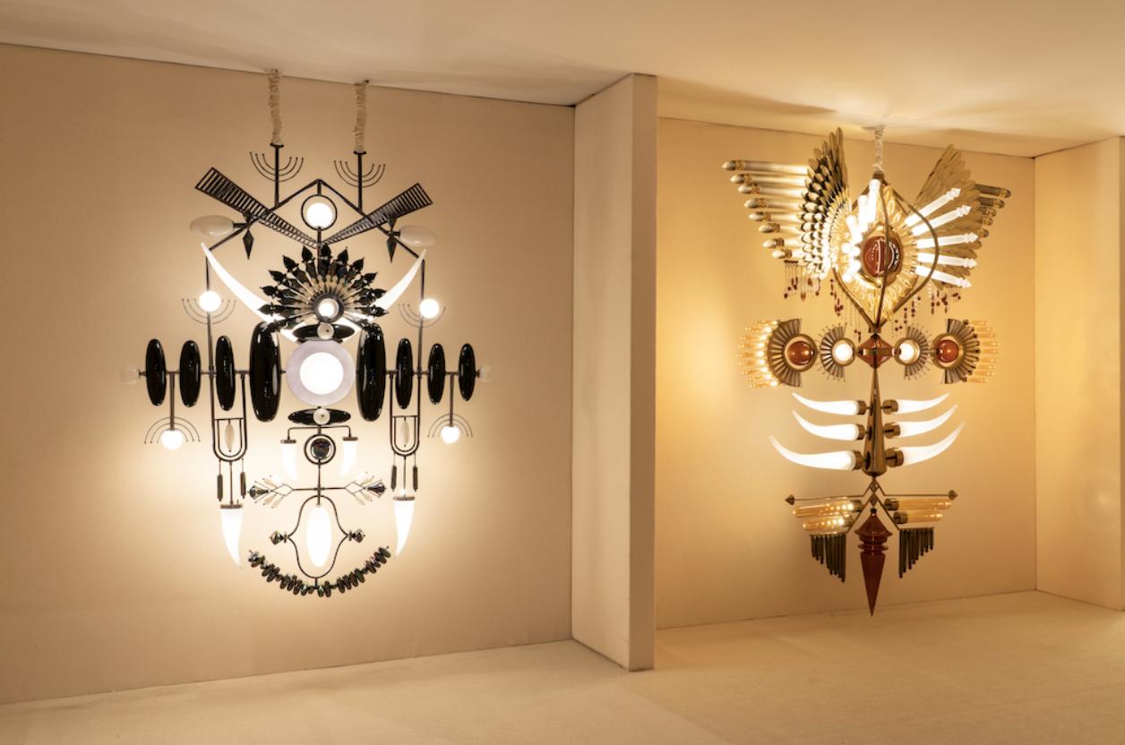 Twolightsculpturesfromthe“TotemsOverTime”seriesbyKlove,seenattheSalonArt+DesignfairinNYC.