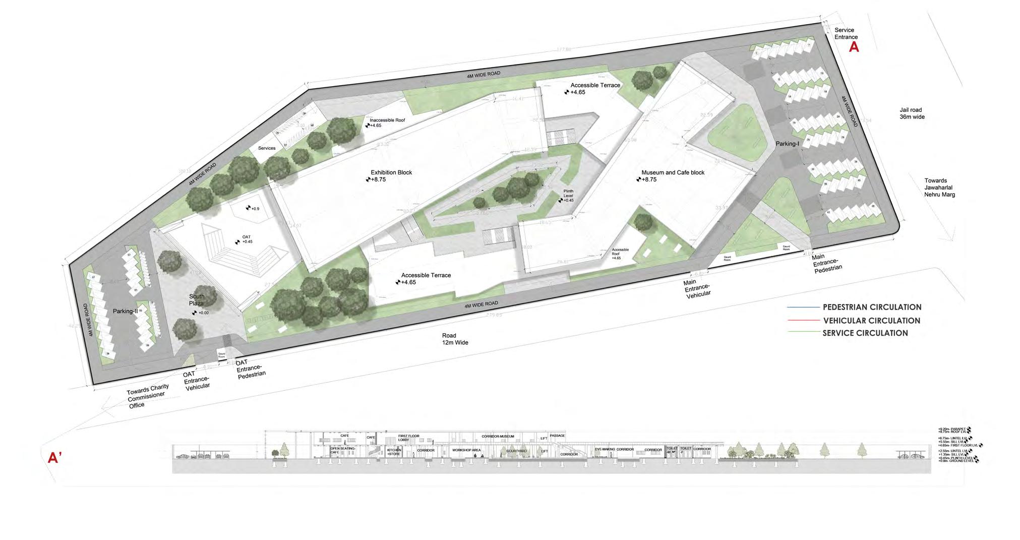 The site is located at a development node near Central Jail of Vadodara. It is approximately 300m from bank of Vishwamitri River. The site is connected to an arterial 50m wide road through a 12m wide road. It is located at 7.5 km from Vadodara Airport, 2.3 km from Vadodara Railway StationThe site has encroachment on it, and the areas are occupied by local handicraft manufacturers and traders who can’t afford representation, (based on informal survey). The programme of the cultural centre could include accommodating these artisans. Vadodara has many cultural centres of different kinds and the average capacity of these centres is 500 people; this helps us derive occupancy for the cultural centre.