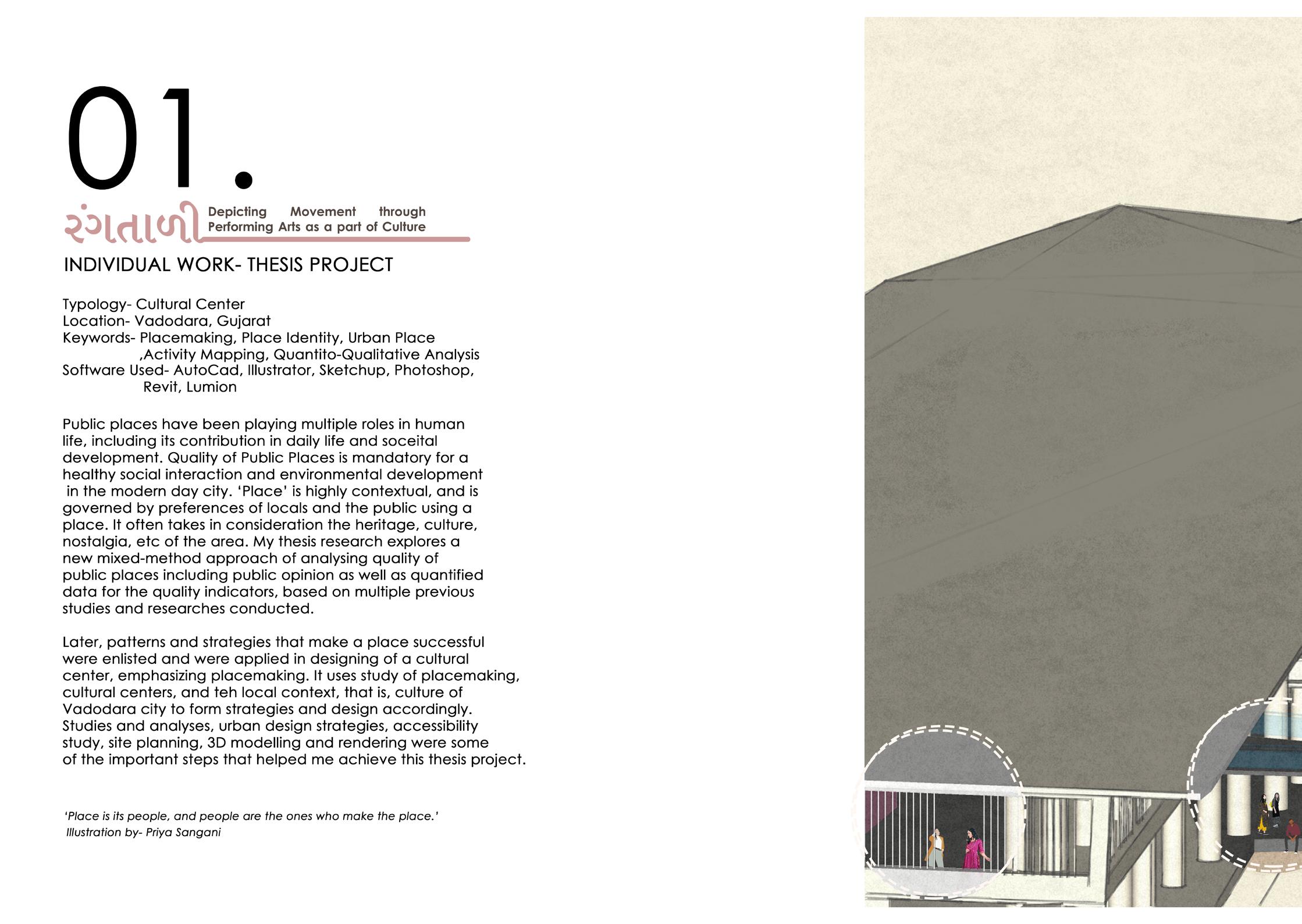 After similarly analysing Sabarmati Riverfront Garden, Ahmedabad and Alembic Arts District, Vadodara, for understanding assessment of quality of public places in Indian context, conclusions were drawn which could be used for devising strategies for designing a cultural center as a good quality public place. To incorporate Placemaking in a cultural center, the following strategies can be helpful- Integration of different spaces on site, Mixed-use spaces for diverse activities- recreational and economic, Relatable activities for community, Halts and points for interaction.
