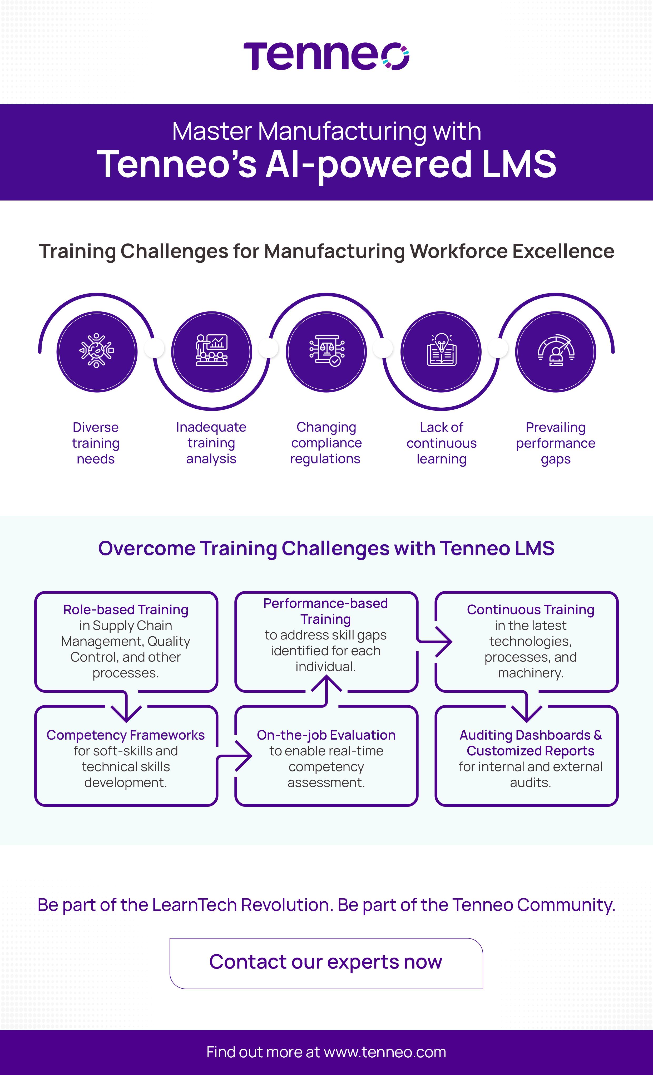 Overcome training challenges of the manufacturing workforce with Tenneo's AI-powered LMS. Address diverse needs, performance gaps, and changing compliance regulations with a platform that makes learning matter with role-based, continuous learning. Learn how Tenneo LMS ensures workforce excellence through performance-based training, competency frameworks, and on-the-job evaluation.