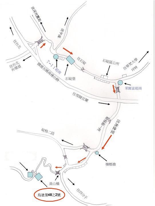 2、通過石碇堡隧道,經過石碇區公 所後右轉,行經淡蘭藝文館,沿 溪邊路續行約3 公里進入烏塗社 區。