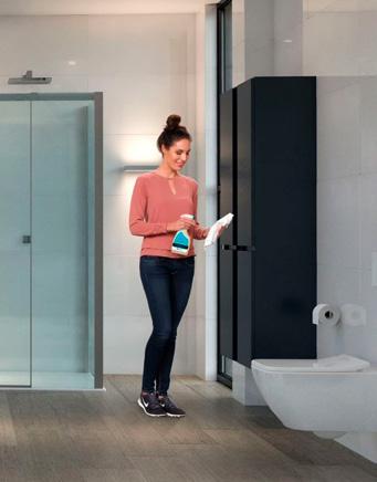 Spray BadkamerSchoon sanitairreiniger niet rechtstreeks op producten met naden, zoals scharnieren en plafondpanelen. Let ook op dat er geen schoonmaakmiddel achter de spiegel komt, waardoor de spiegel aangetast kan worden.