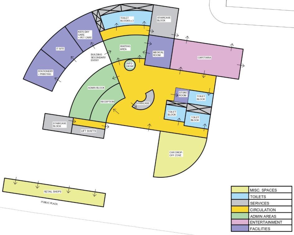 LOCATION OF RETAIL SHOPS TOWARDS THE EAST OF THE SITE RESULTS IN CREATION OF PUBLIC PLAZAS, VISITOR’S PARKING LOTS AND EASY CIRCULATION. IT ALSO HELPS IN REVENUE GENERATION FOR THE SITE.