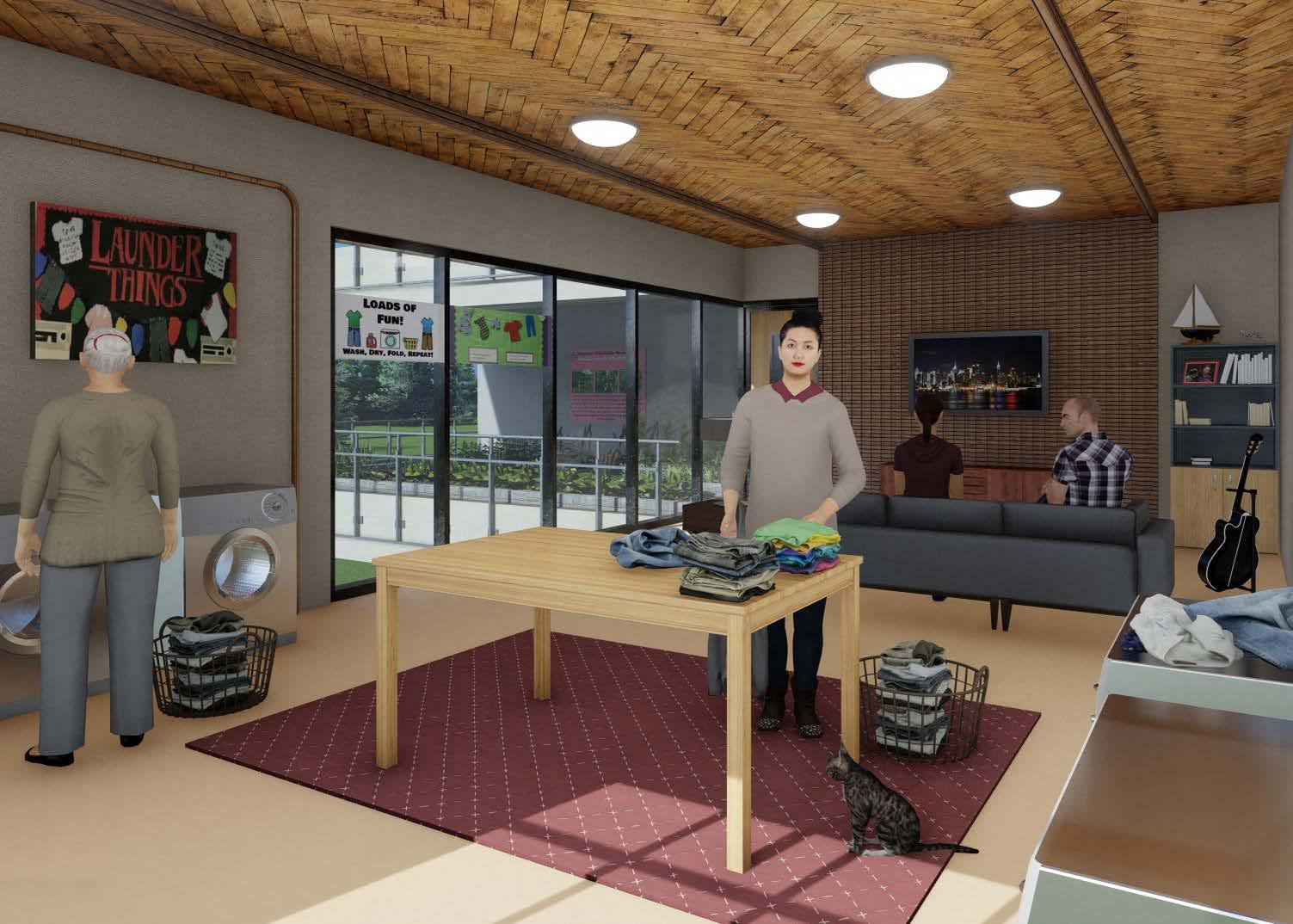 Laundry is envisioned as a place for interaction and is coupled with a TV lounge. The room also has musical equipments and games to spend quality time learning a new skill. Edible garden across provides a connection to the greens.