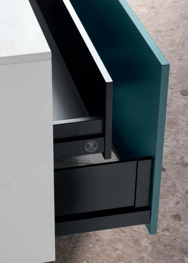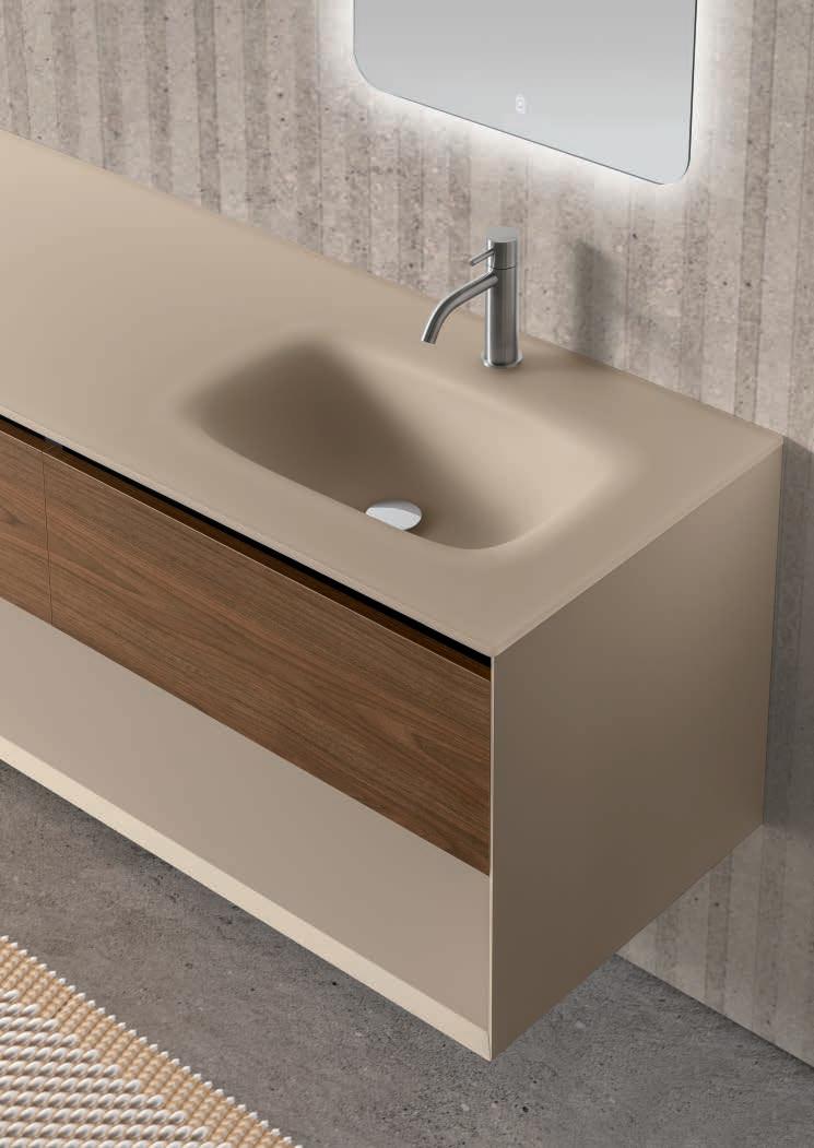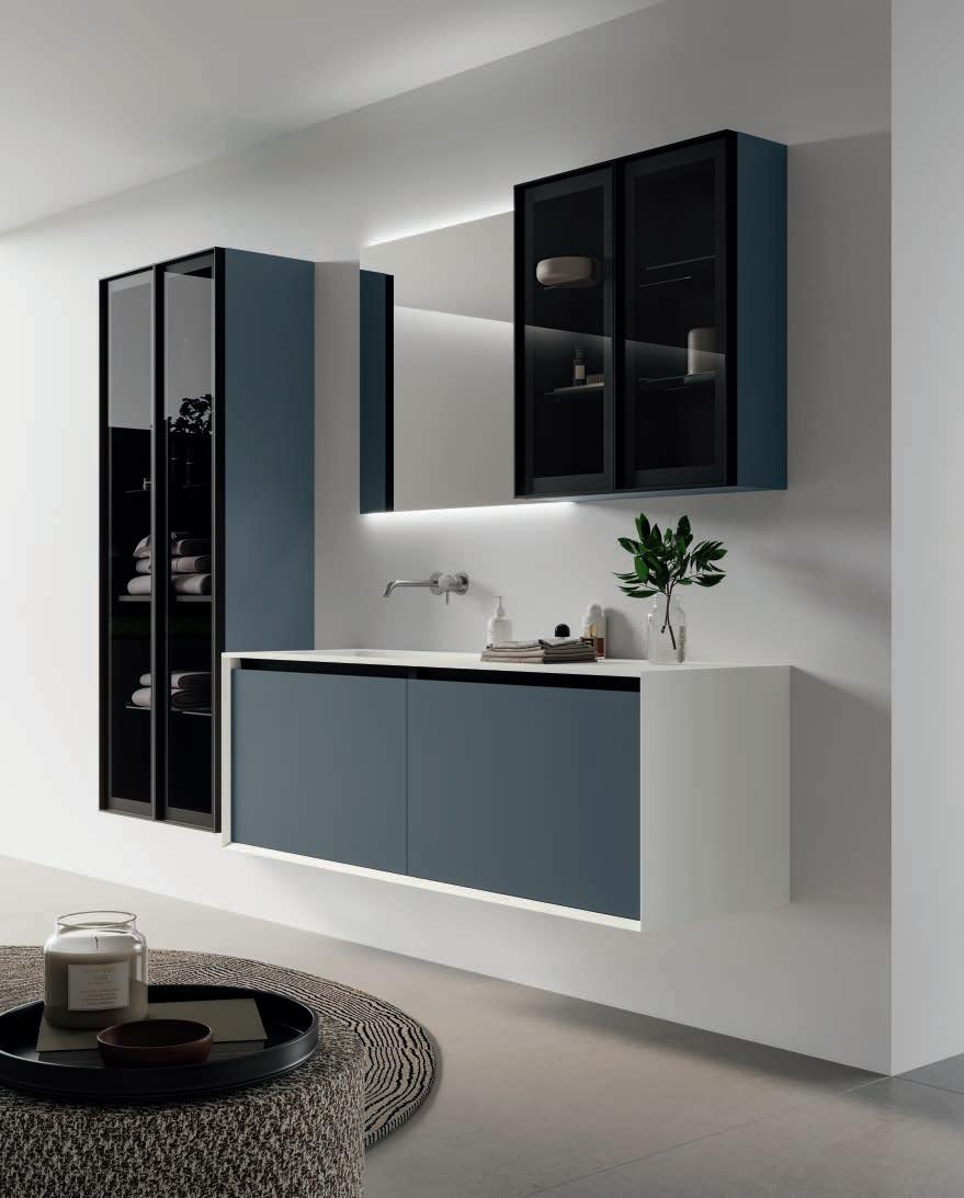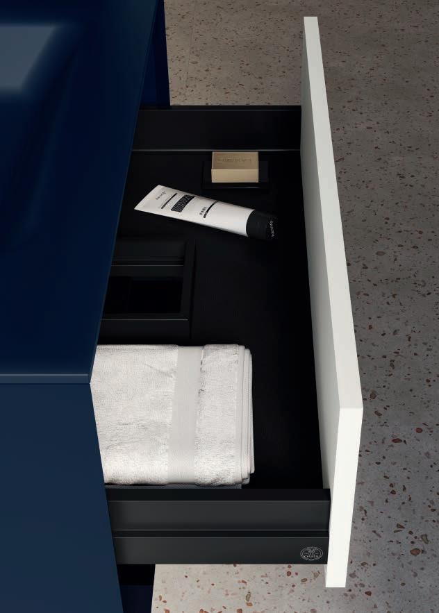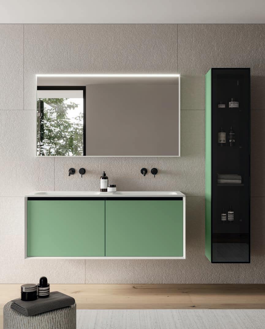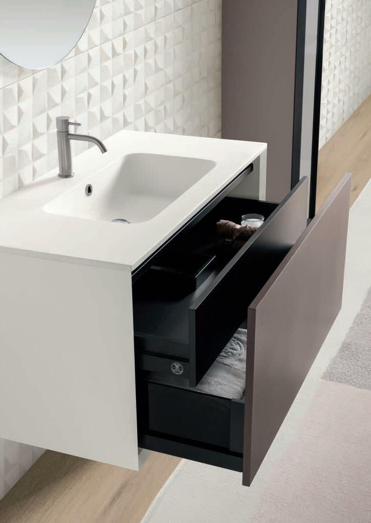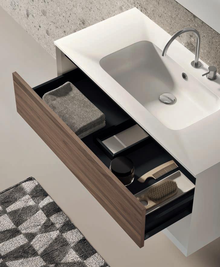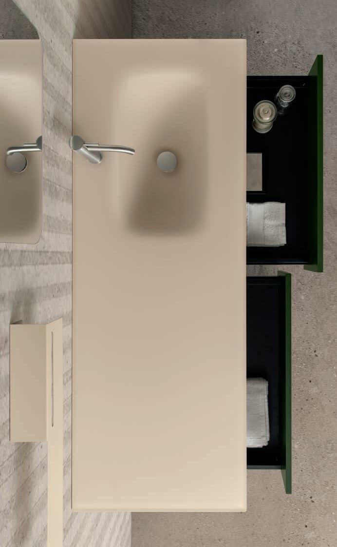 The collection offers wide modularity thereby making it suitable for all types of contemporary bathrooms, from functional spaces to more ambitious “salle de bain” settings. Clients can opt for units with open style storage as well as drawers in contrasting finishes, where desired, thanks to a choice of 33 matt lacquers and four wood types.