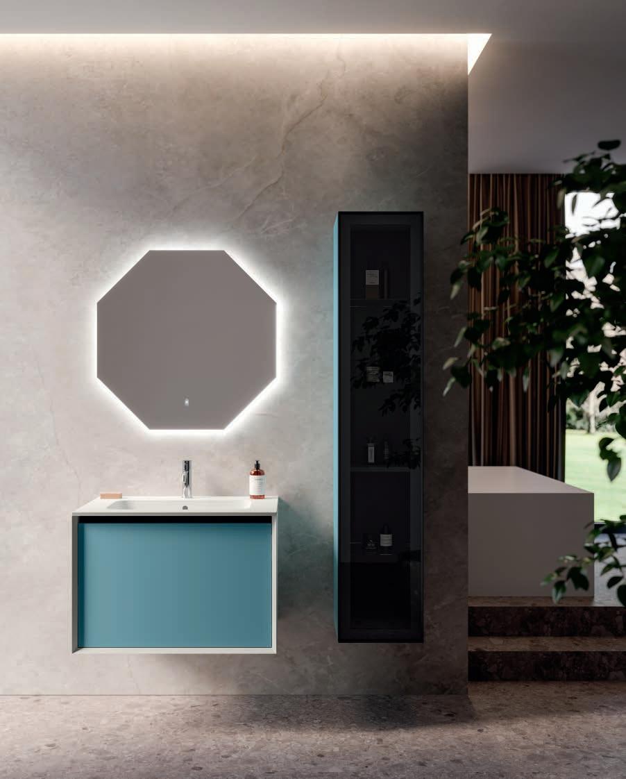 The Smartcode structure is characterised by 45° angles which highlight its linear design, one which is carefully crafted and highly modern. Also available to complete the overall look is an array of complementary items such as mirrors, baths, taps and small bathroom accessories.