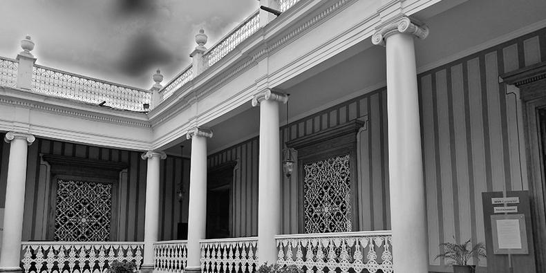 Sus columnas , cubiertas con madera,so bre las bases de mármol y capiteles jóni cos.Las ventanas con sus rejas con cana peo yrepisa, estilización de origen napo leónico y con su diseño transparente lleno dearmonía entre curvas y rectas.