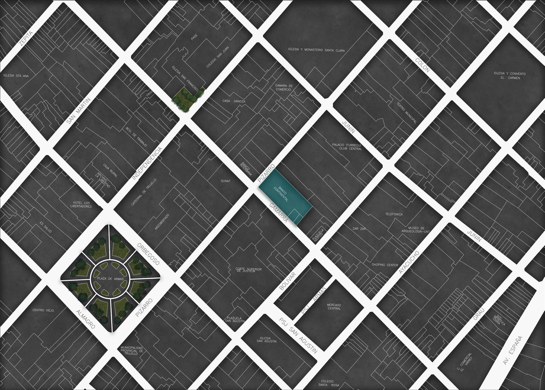 Contexto mediato: Los hitos identificados son la plaza de armas, la plazuela El recreo, el mercado central y la catedral de Trujillo.
