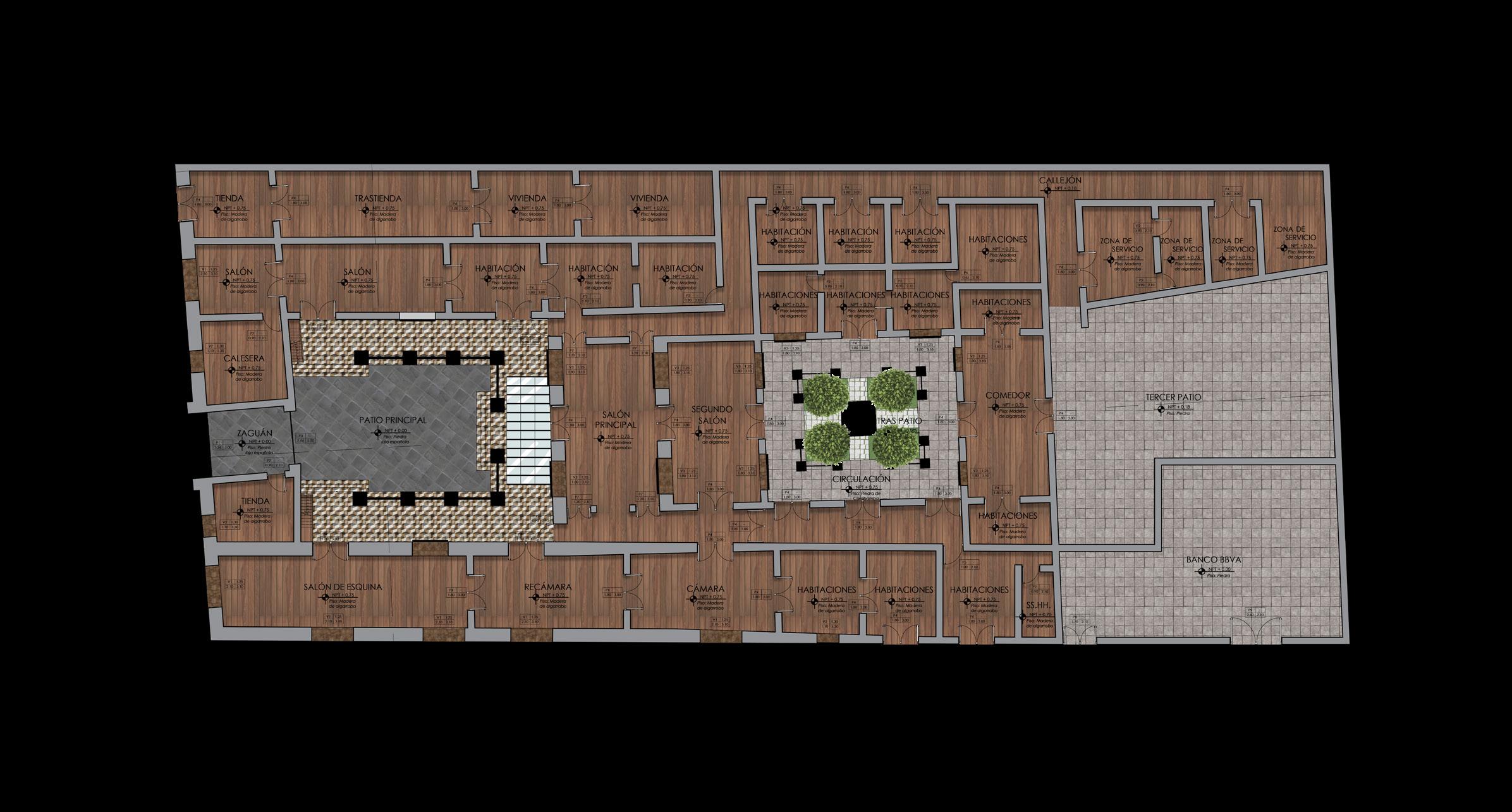 Zaguán Primer patio Segundo patio Tercer patio Salón principal Segundo Salón Comedor Tienda Trastienda Circulación Salón Calesera Salón de la esquina Vivienda Habitación Recámara Cámara Habitaciones Zona de servicio
