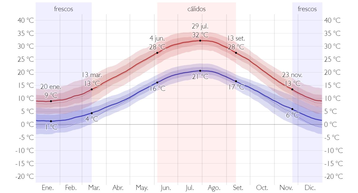 Además en otoño las temperaturas máximas diarias disminuyen 17 °C, de 30 °C a 12 °C y bajan a menos de 8 °C o exceden 33 °C. Las temperaturas mínimas diarias disminuyen 13 °C de 18 °C a 5 °C y bajan a menos de -1 °C o exceden 21 °C. Por último se sabe que la estación mas lluviosa es Primavera.