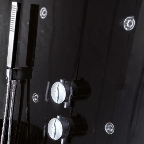 A concentration of technology that makes the glass a Tecnovetro, according to UNI EN12600. According to UNI EN14428, the glass in a shower should be tempered, i.e. with defined fragmentation standards. This is tempered glass with a membrane thickness of 100 microns that controls glass fragmentation in the event of breakage, limiting possible damage to the environment.