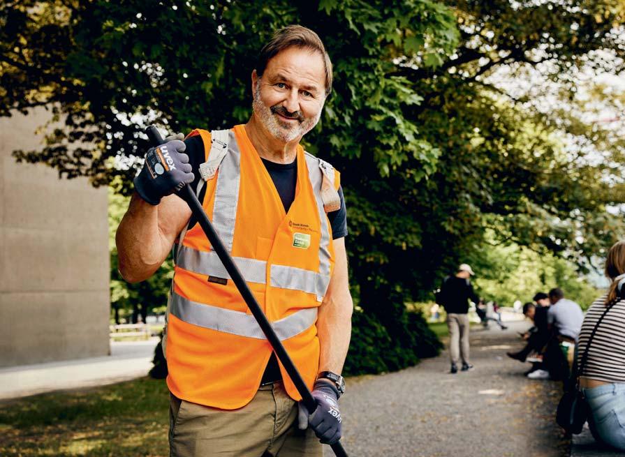Lorsque je pars en mission avec mes gants en caoutchouc, mon râteau et mes sacs poubelles, c’est pour ramasser les détritus qui jonchent le sol, les escaliers et les murailles du Platzspitz, le parc municipal zurichois. Autour des poubelles traînent des mégots, restes de nourriture, paquets de chips vides, couverts jetables, bouteilles en verre et canettes de coca. Je fais ce travail bénévole une fois par mois, pendant mon après-midi de libre. J’ai mis en place cette action de nettoyage en concertation avec le service de ramas sage des déchets et de recyclage de la ville de Zurich. Cette activité est pour moi aussi l’occasion d’aller à la rencontre des autres: je suis dehors avec des amis, je fais quelque chose d’utile et la connaissance d’une multitude de gens. Ce travail m’apporte beaucoup.