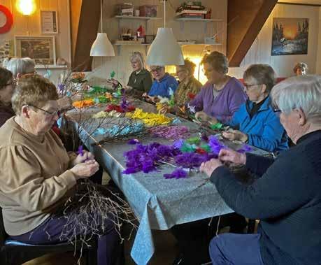 Sanitetskvinnene i Mære har laget fastelavnsris så lenge de kan huske. I år fikk foreningen et tilbud fra «Inn på tunet»-bedriften til Joar Vådal og Bente Droigk på gården Vådal Nedre i Sparbu. De har skoleelever som trenger et tilpasset opplegg, så i år kunne de sette fjær på de ferdig plukkede 200 risene.12 damer fra Mære sanitetslag er her i full i sving med å lage årets ris.