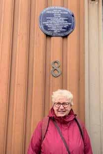 Her Heidi Folvik utenfor Fredrikkes første barndomshjem, der N.K.S. sin stifter bodde frem til familien flyttet til By gård. Foto: Lina Steinsbekk.