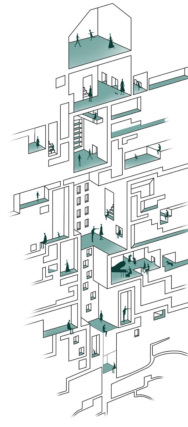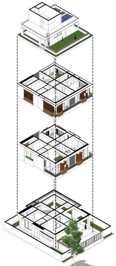 Rendered exploded axonometric for Sanjay Jadhav Residence, Nashik