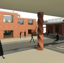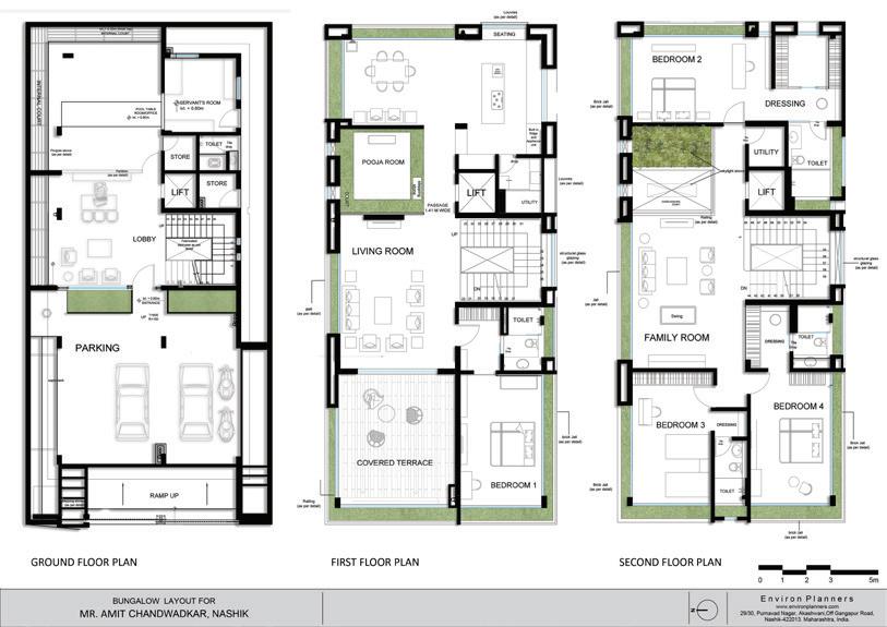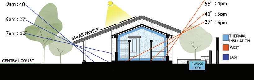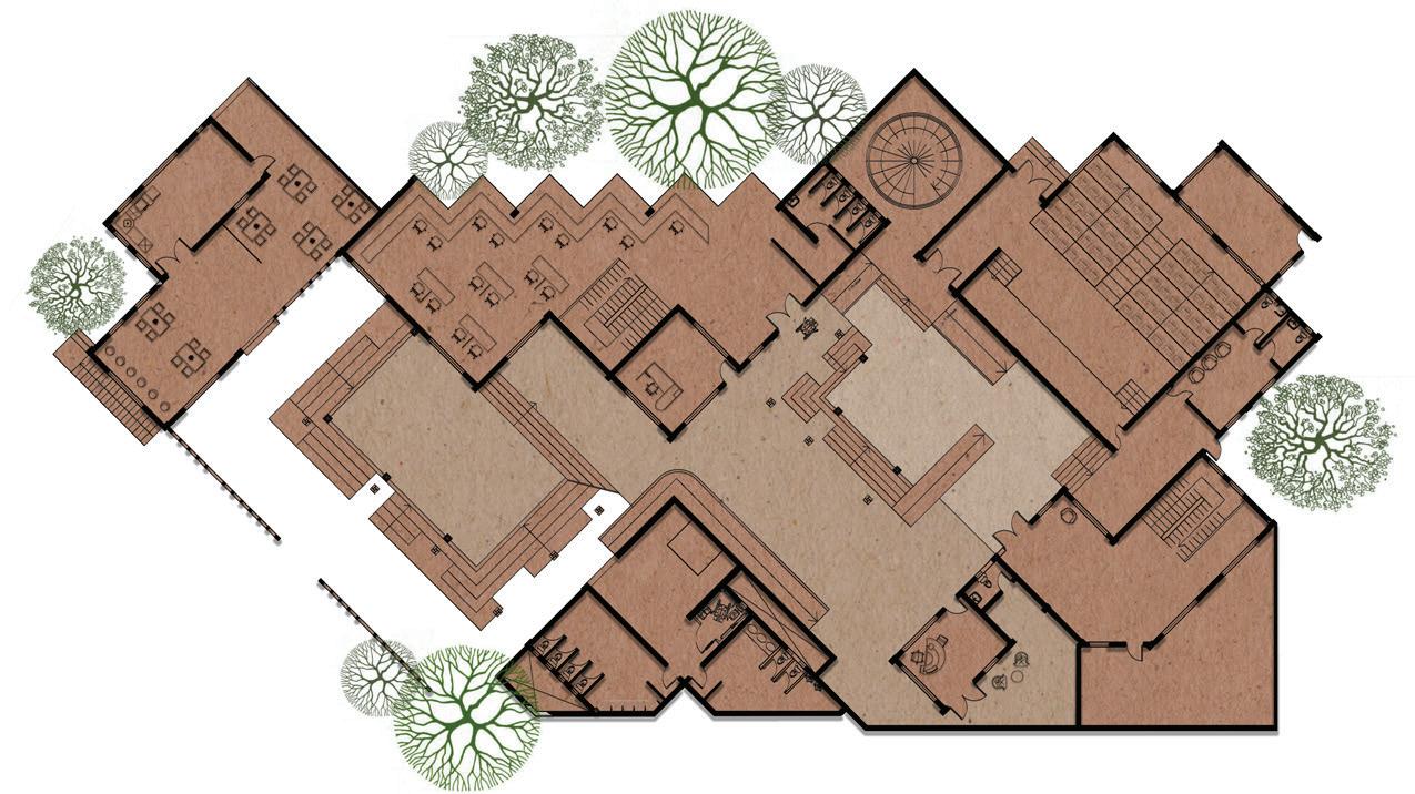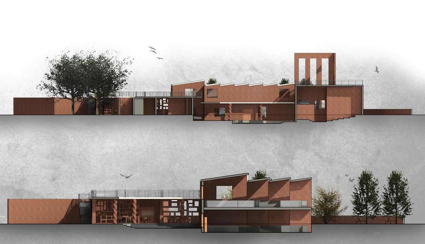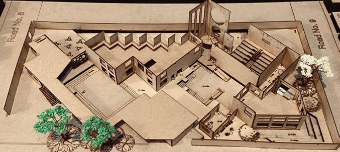 Furthermore, the inclusion of northfacing windows in the study center allows ample natural light and ventilation, and the entire structure is supported by solar panels. This north orientation not only enhances natural lighting but also helps maintain a cooler environment. The spiral staircase stands out as a central feature, leading to the green roof, making it a focal point of the design.