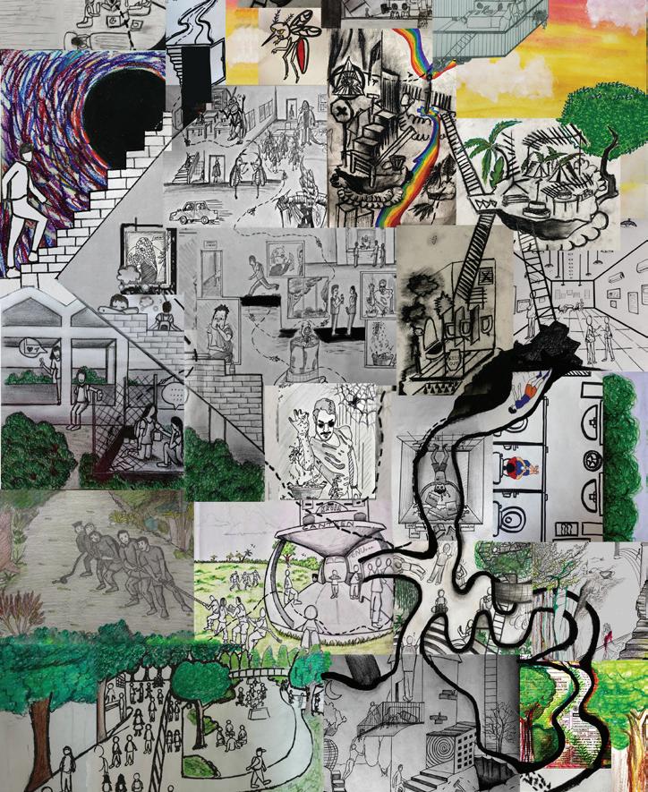 The school was imagined to turn into a factory where students worked like robots, day and night to produce work. The life inside and outside of the college was depicted to be completely opposite, transforming the student based on the environment. To escape from this monotous machine life, students were imagined to go outside to the garden and ground to play, gossip and unload their burden, again ending up spending their nights crawling back to those studio spaces to repeat the cycle all over again. The drawing depicts that cyclic rhythm that is imbibed by the student while they work like machines.