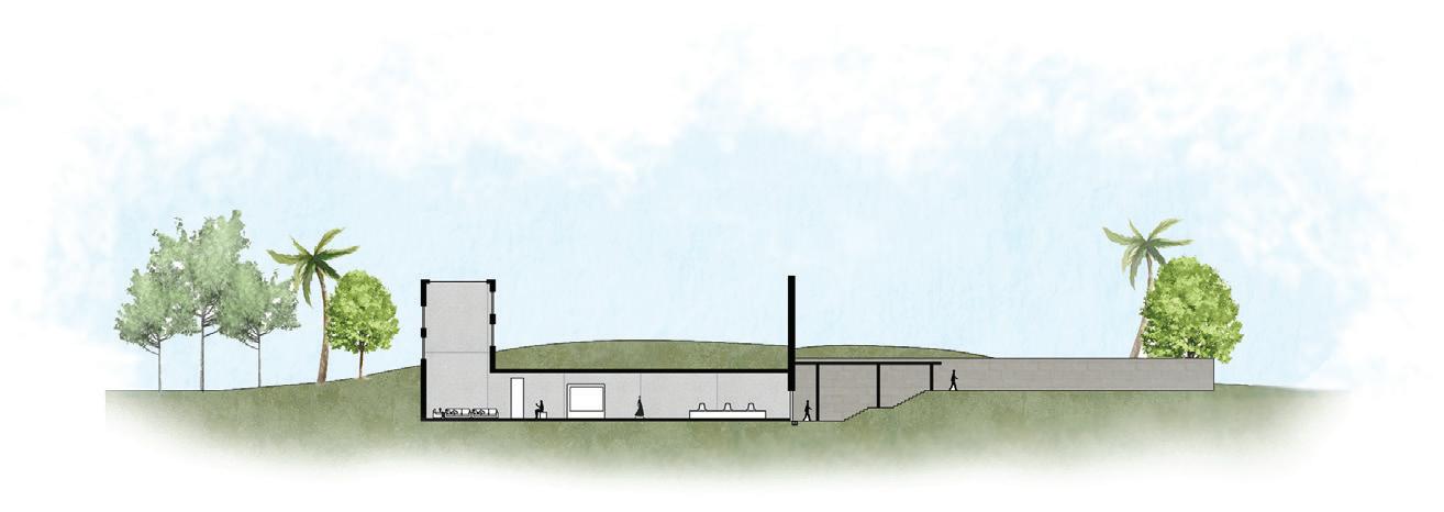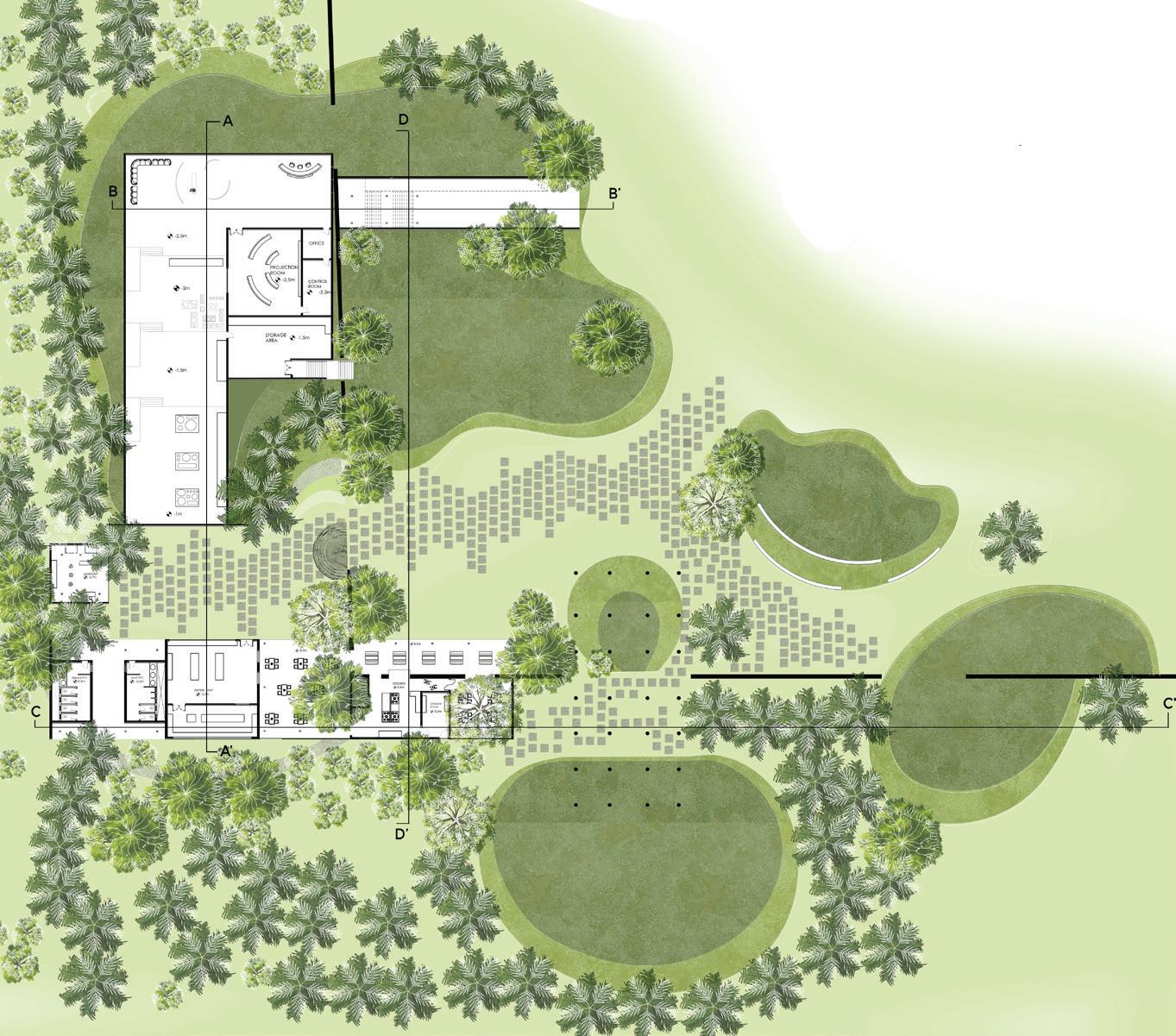 Nature is a crucial element in this endeavor, contributing to a sense of comfort and tranquility.The project places a significant focus on the circulation within the spaces. The mounds, which introduce a sense of irregularity amidst the uniform program spaces, play a key role in how individuals move through the area.