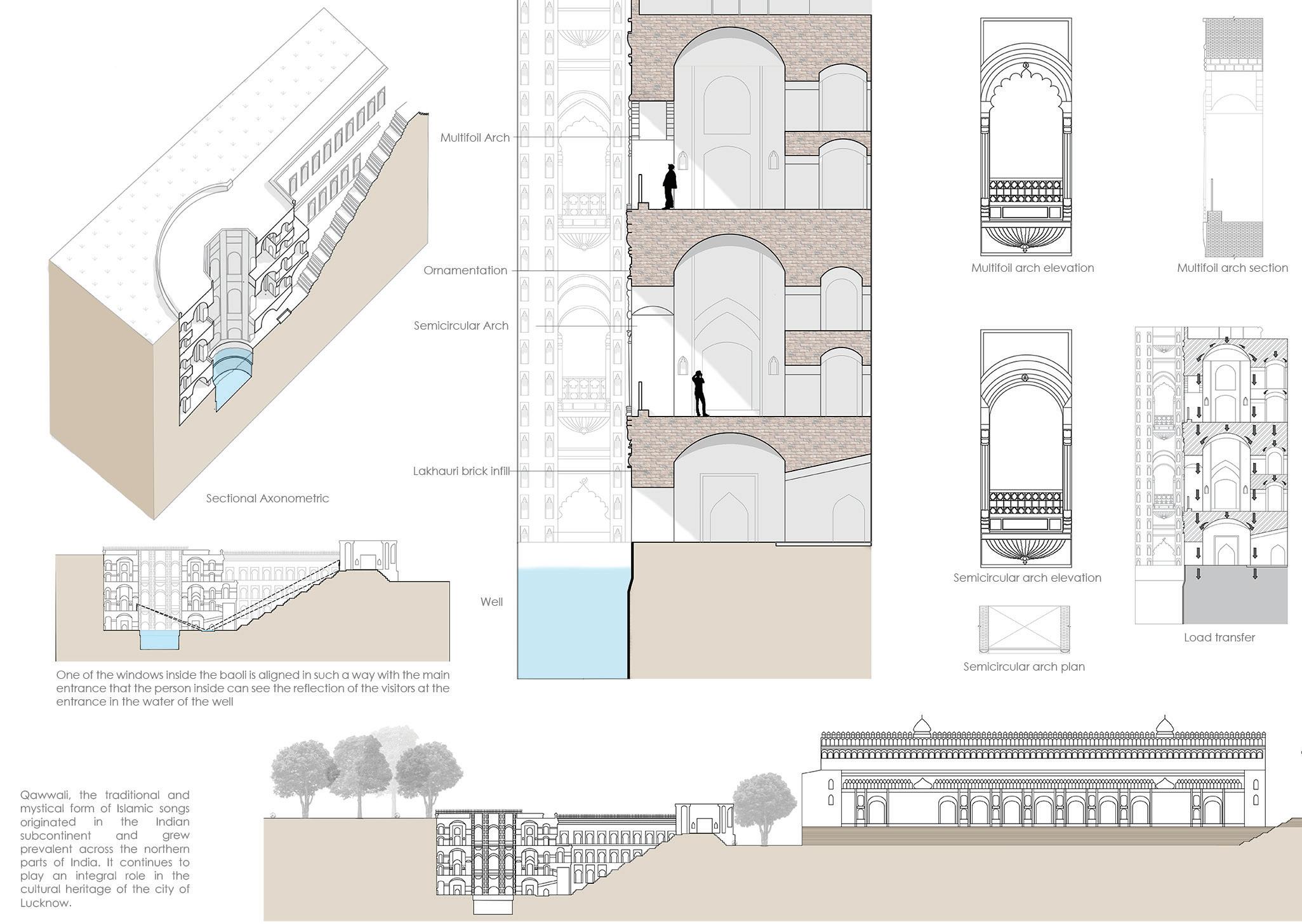 SHAHI BAOLI The Shahi baoli built on the left flank of Nawab Asaf - ud - daula’s Imambard in Lucknow is a typical Indo - Mughal architectural design. The structure is 5 storeyed set in a rectangular plan having open interconnected galleries and cells at each level. The first 2 storeys were above water and the rest were perennially under water.