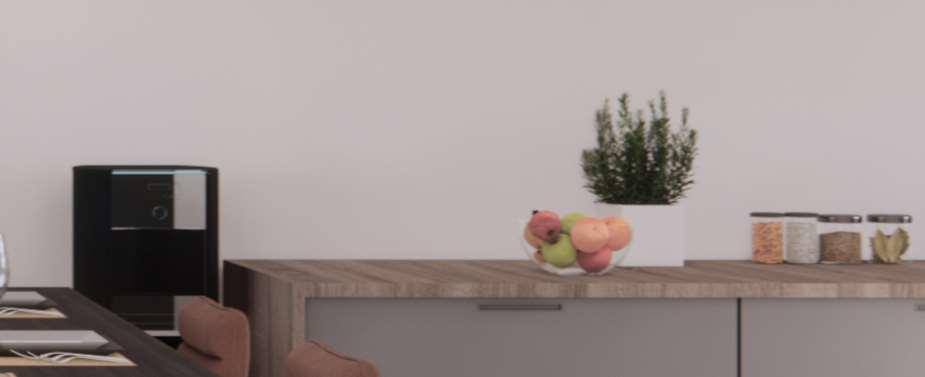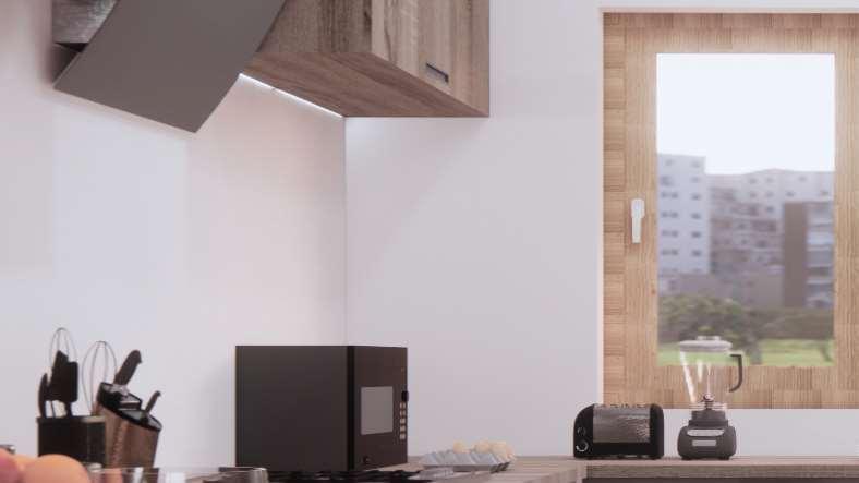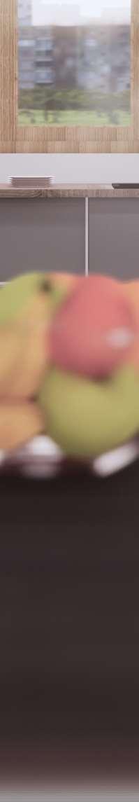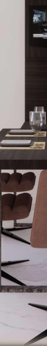 The L-shaped kitchen design represents the epitome of ergonomic ingenuity, seamlessly combining storage optimization, work triangle efÞciency, and intuitive trafÞc management. Its strategicplacementinthecornersanddualopen ends afford unparalleled accessibility and multiple entry points, accommodating the demands of any kitchen size. Illuminated by soft, indirect lighting Þltering through adjacent windows and sliding glass doors, the kitchen radiates a balanced luminosity that accentuates its functionality and visual appeal. The L-shaped kitchen harmonizes form and function, transforming the cooking and cleanup experience into a seamless and gratifying endeavor.
