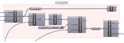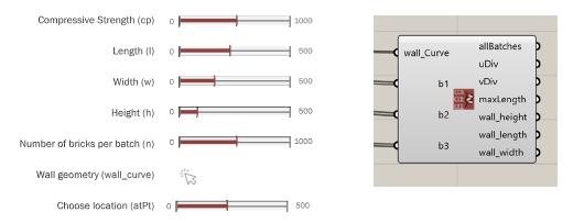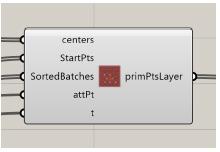 To construct a strong wall users might prioritize bricks with higher compressive strength. Primary distribution refers to the first distribution of bricks with higher cp. This component will take input from ‘sortedBatches’, centroids of each bricks panels, and attractor point, which will select a random number of starting points based on the user’s preference given through attractorPt. This attractor point can be selected in two ways- using a number slider or evaluate curve option. From the list of generated list of points, 50% (t) of the initial points will be selected. It will further check the available number of bricks in the batch.