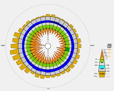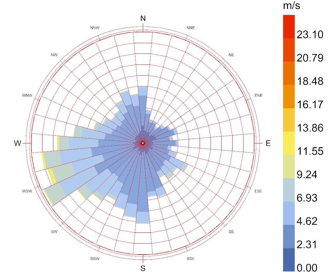 Wind prevails almost throughout the year in Pittsburgh.Although the winds coming from the West and South-West have greater velocity, upto 5.37 m/s, “calm winds” are experienced throughout the year from all the directions.South-West is the predominant wind direction observed annually.