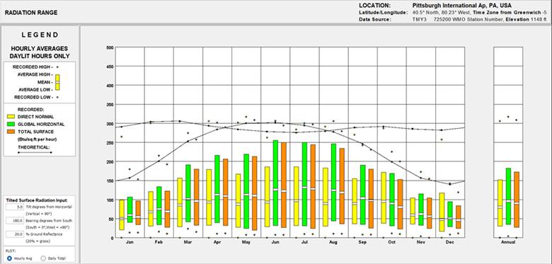 The Center for Sustainable Landscapes (CSL) is a 24,350 square foot education, research and administration facility located in One Schenley Park Drive, Pittsburgh, PA. This sustainable building consists of 3 stories & green roof that is nested into the hillside on a 2.9-acre remediated brownfield. Built to achieve net-zero energy consumption, the facility generates all of its own renewable energy and treats all stormwater and blackwater captured The climate data used is extracted from the TMY3 format from the EnergyPlus website and applied into IES-VE. In addition, the year-round sun angle calculation and sun shading analysis is conducted through IES-VE SunCast internal software.