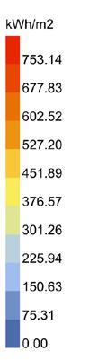 The figure shows the total radiation for the sky dome. The surface PV design should be normal to the maximum solar radiation point.From the calculation of components, the angle between the pv panel and y-axis is 41 degrees and between x-axis is 295 degrees.
