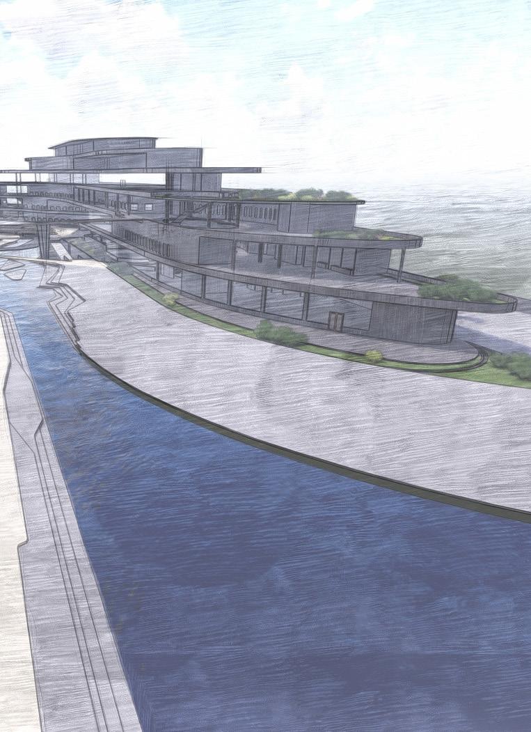 The scope of the project is developing an environmental waterfront which consists of edge treatment and stabilisation, promenades and public spaces with an urban infill - “Mixed use development” along the Vrishabhavati river, where all groups of people can create a continuous hub of activities. The architectural development includes a mix of research , retail, housing, restaurants, auditorium and spaces that contain dynamic activities. It also includes a series of demonstational spaces that attempt to educate the public about the various water managemnet systems.