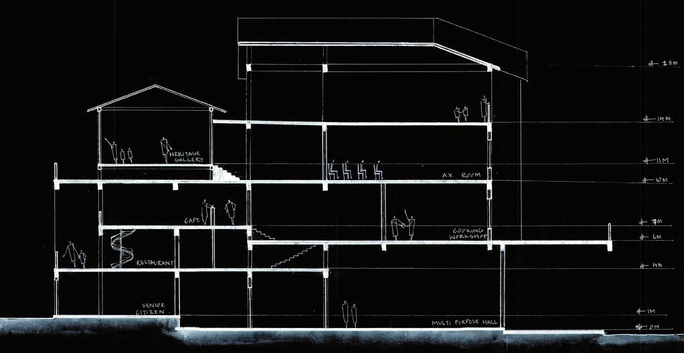 The program arises out of observing the existing condition of the built heritage that is undergoing slow decay. Ways of rejunivating the place need to be deliberated upon. This would include queries regarding how to keep the culture and built heritage alive. The program involves exploring ways of modulating scale to create presence at the precinct level but an appropriate one at street level considering the proximity of the heritage buildings flanking the site.