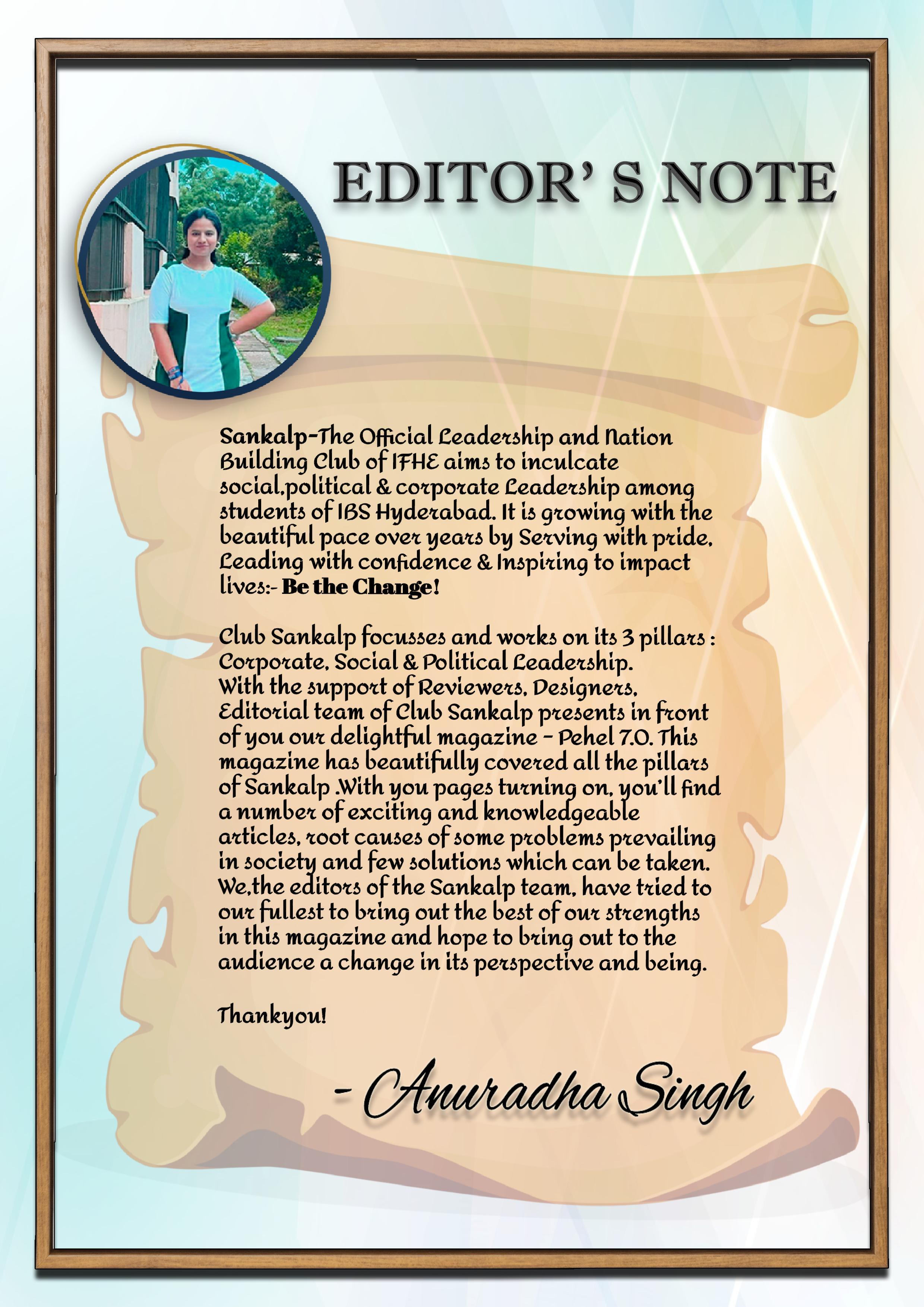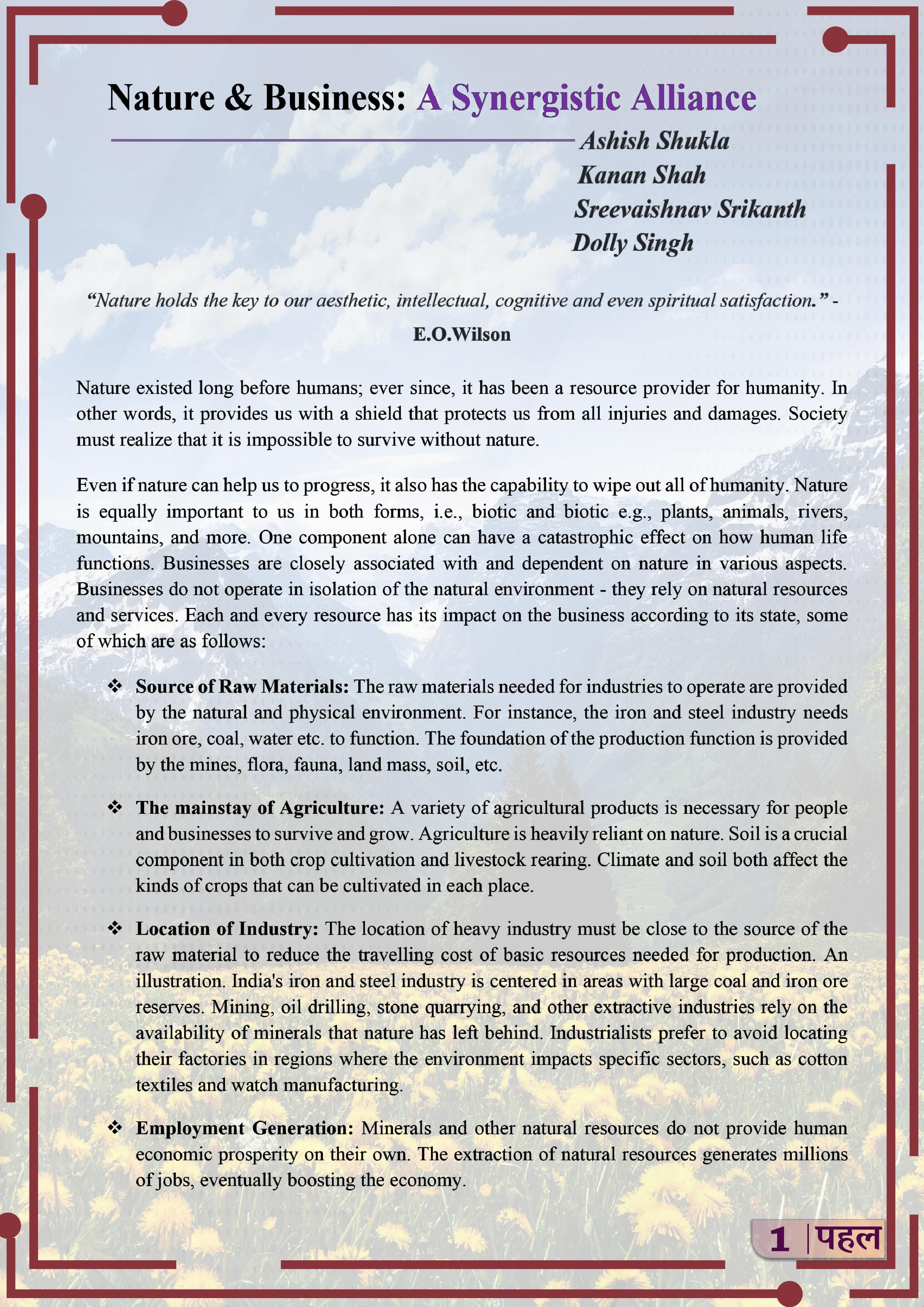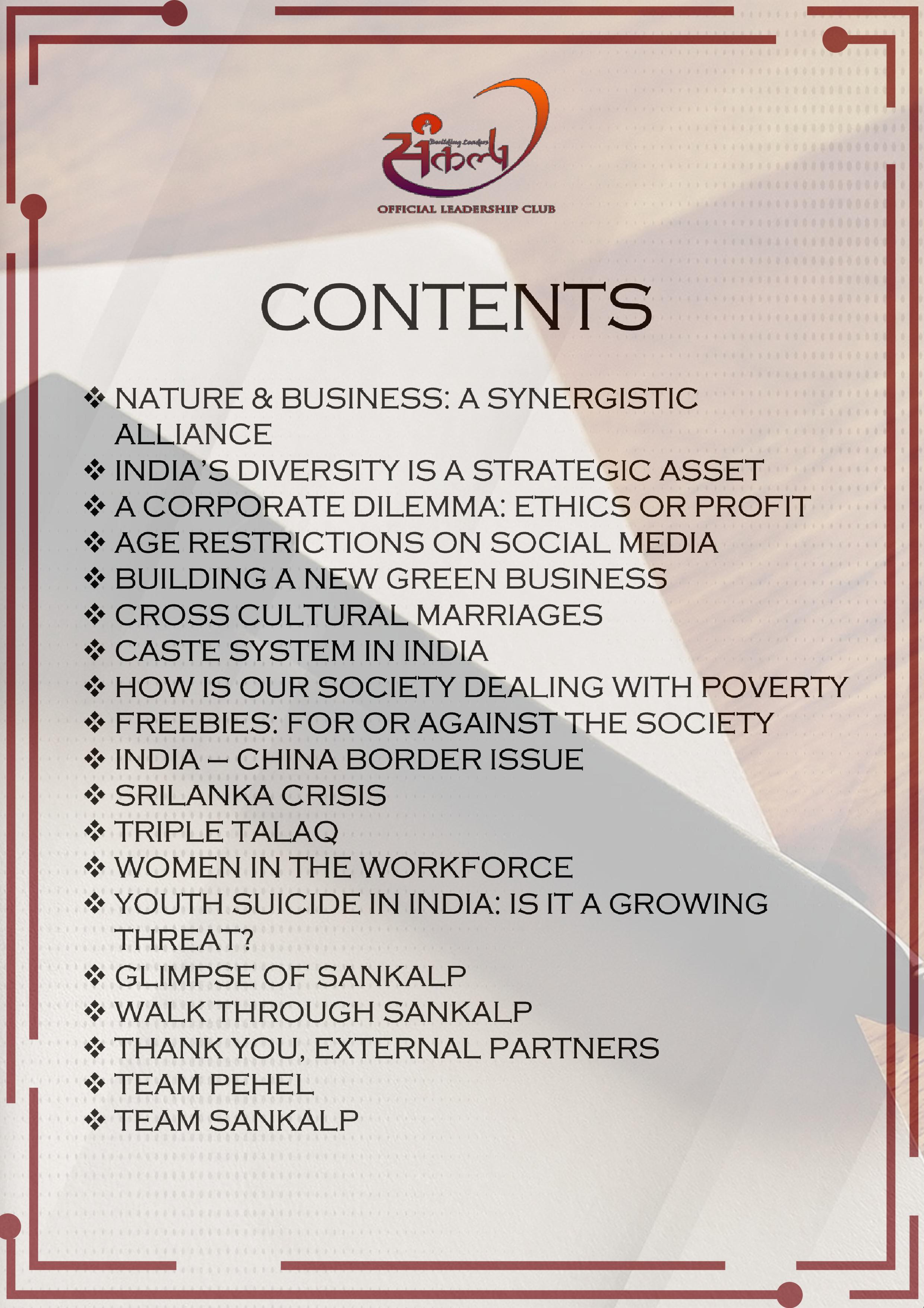 Pehel is the annual magazine of Club Sankalp. It strives to bring to the forefront the various issues related to Social, Political and Corporate sphere and aims to bring about a change in the world and in one's mind. Theme for Pehel 7.0 is Synergy between nature & Business. Pehel is very close to the heart of many and hence I would love everyone to spend few minutes to read this magazine.