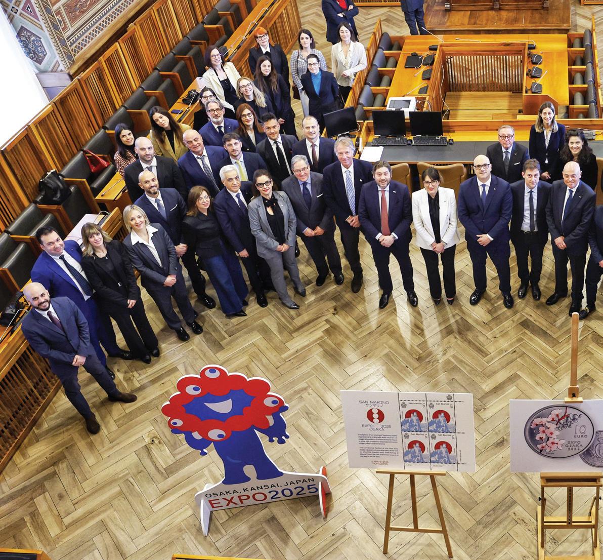 re per celebrare la partecipazione della nostra Repubblica all’Esposizione Universale di Osaka”, ha espordito il Direttore Generale Gian Luca Amici. “Due piccoli oggetti dal grande valore simbolico: custodiscono la nostra storia, rappresentano la nostra identità e incarnano il nostro desiderio di crescita e di connessione con le altre nazioni […] Il francobollo e la moneta che oggi presentiamo sono simboli tangibili di questo momento. Oggetti preziosi non solo per i collezionisti, ma veri e propri testimoni dell’impegno di San Marino nel promuovere la propria identità e i propri valori nel contesto internazionale. Il loro design riflette il legame tra la nostra antica Repubblica e il dinamismo dell’Expo, sottolineando il valore dell’incontro tra culture diverse.