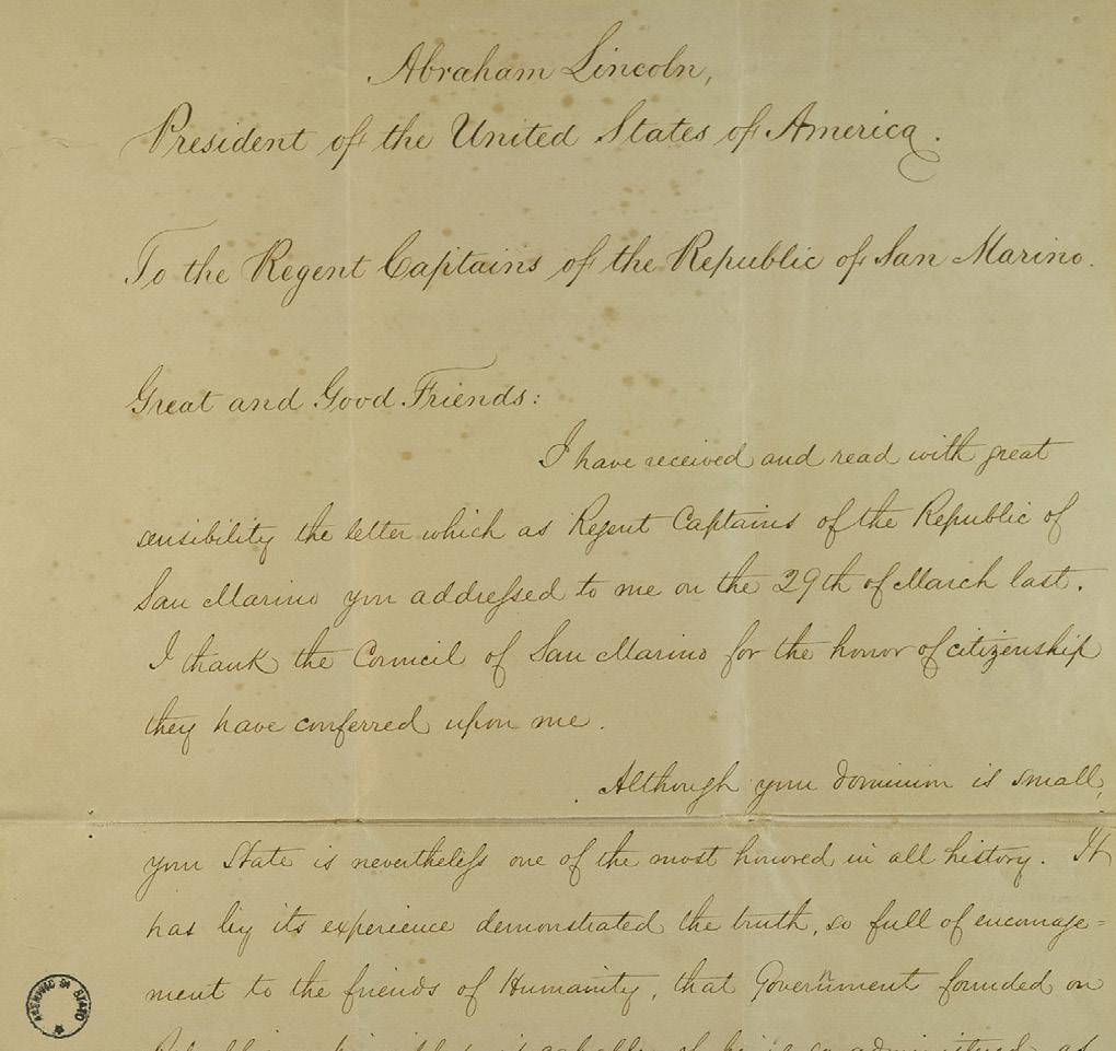 zione, New York, che probabilmente sul Titano si pensava, erroneamente, fosse la capitale degli Stati Uniti. L’errore, ad ogni modo, non impedì a Lincoln e Seward di ricevere la lettera e rispondere, il 7 maggio dello stesso anno, con parole di ringraziamento piene di stima per l’amicizia offerta da parte del piccolo Stato: “Grandi e Buoni Amici. Sebbene l’estensione dei vostri domini sia piccola, il vostro Stato è nondimeno uno dei più onorati di tutta la storia. Esso ha dimostrato, con la sua esperienza, la verità, così piena di incoraggiamento per gli amici dell’Umanità, che un Governo fondato sui principi repubblicani può venire amministrato in modo da essere