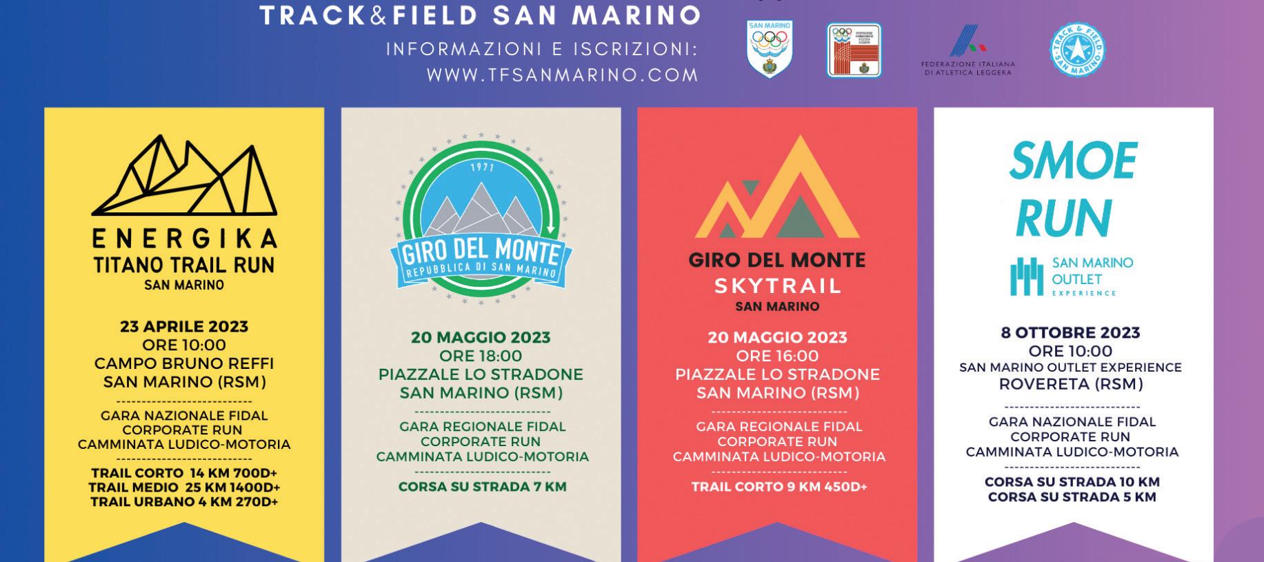 partenza alle 18, e il nuovo SkyTrail da 9 km sui sentieri attorno al monte Titano, con partenza alle 16, in questo modo sarà possibile gareggiare in entrambe le competizioni, partecipando alla classifica combinata. Domenica 8 ottobre si terrà infine la SMOE Run, percorso veloce di 5 e 10 km nella zona di Rovereta, valevole come prova del Campionato sammarinese di corsa su strada 2023.