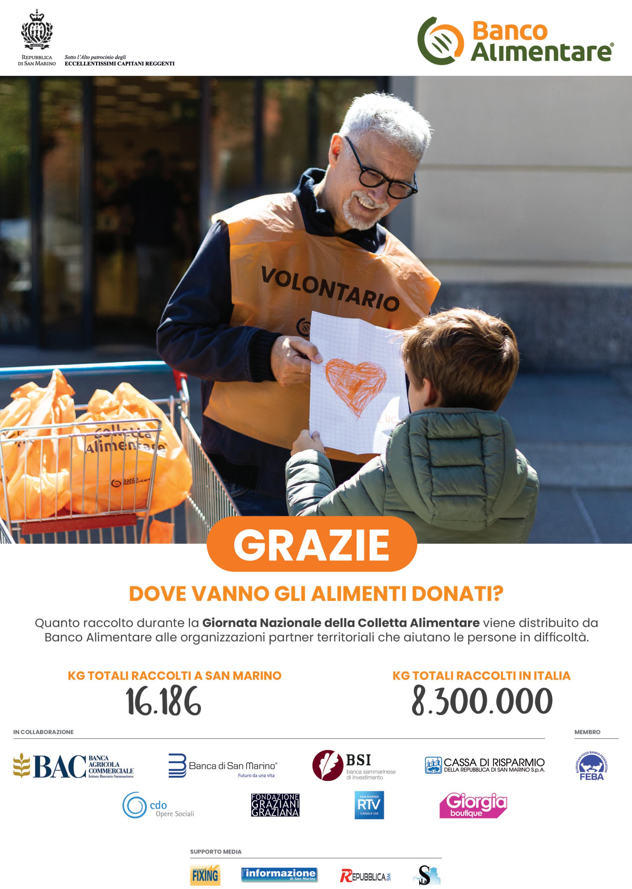 nei prossimi mesi 1 milione e 800 mila persone bisognose attraverso 7.600 enti caritativi convenzionati. Incremento importante si è registrato anche nell’area del Montefeltro dove sono stati raccolti 5.854 Kg di alimenti, +5% rispetto al 2024. A San Marino sarà la Caritas Vicariale a distribuire durante tutto l’anno gli alimenti raccolti, con il supporto costante del Banco Alimentare Emilia-Romagnache da sempre sostiene la Colletta sul Titano - presso il Centro Casa San Michele, dove vengono assistite circa 200 persone. Insieme a tutti i Capi Equipe e ai volontari che hanno lavorato intensamente per questa giornata, l’associazione Amici del Banco Alimentare San Marino ringrazia sentitamente per il supporto gli Ecc. mi Capitani Reggenti per il Patrocinio concesso; Fondazione Graziani; Banca Agri-