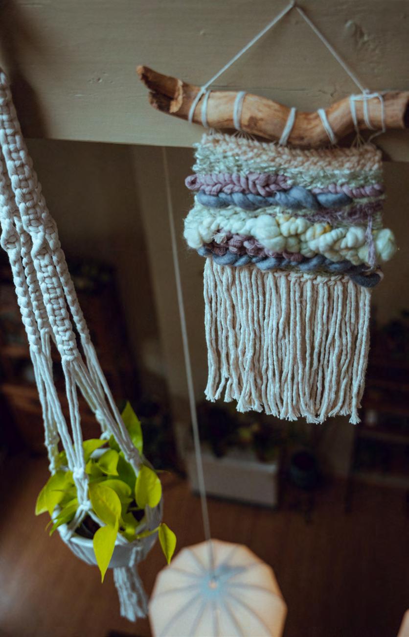 “Ik maak liefst van al wandhangers, maar ook plantenhangers, sleutelhangers, handtassen, vlaggetjes, lampionnetjes, … Vooral kleine gebruiksvoorwerpen en decoratie dus. Voor grotere werken - zoals hangmatten en stoelen - is de stap nog iets te groot. Ik wil niet te veel uitmeten en voorlopig nog gewoon genieten en experimenteren. De hoeveelheid restjes in mijn atelier toont ook dat ik niet zo graag afmeet (lacht), maar die restjes gebruik ik wel in ander weefwerk!"