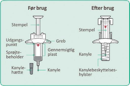 Smid den brugte sprøjte og kanylehætten i en beholder til skarpe genstande. Du skal ikke sætte kanylehætten på en brugt sprøjte.