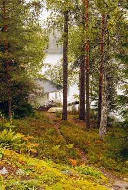 木造の建物に向か う路地にはマツ の木が並んでい て、 無塗装の伝 統的な柵が、木 々の後ろに四角い広場を形作って います。この辺りの多くの場所と違 って、柵はトナカイの侵入を防ぐた めではなく、人間の目には見えな い何かを捕まえるために作られた ようです。
