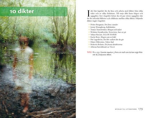 sig i att göra textnära litterära analyser. Ett antal litteraturvetenskapliga begrepp gås igenom och exemplifieras. Blocket Svenskan i ständig förändring – en historia om språket ger en överblick över svenska språkets utveckling men handlar också om andra språks ursprung och vad som gör att språk hela tiden förändras.