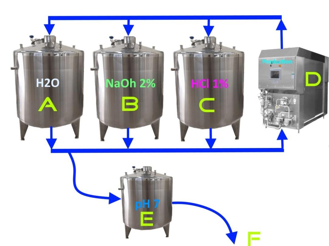 4. Absäuern: Um Kalkablagerungen und Milchstein zu entfernen, wird nun mit Säure (z.B Salzsäure 1%) in Zirkulation gereinigt. D. Säure wird im Zwischentank D gelagert