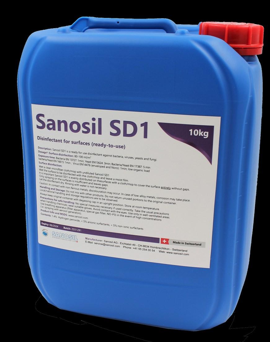 Sanosil SD1 is a cutting edge, fast acting surface disinfectant. Its formula is based on hydrogen peroxide reinforced with various surface active substances and offers excellent wetting properties even on hydrophobic (water repellent) or slightly greasy surfaces (e.g. hand and fingerprints).