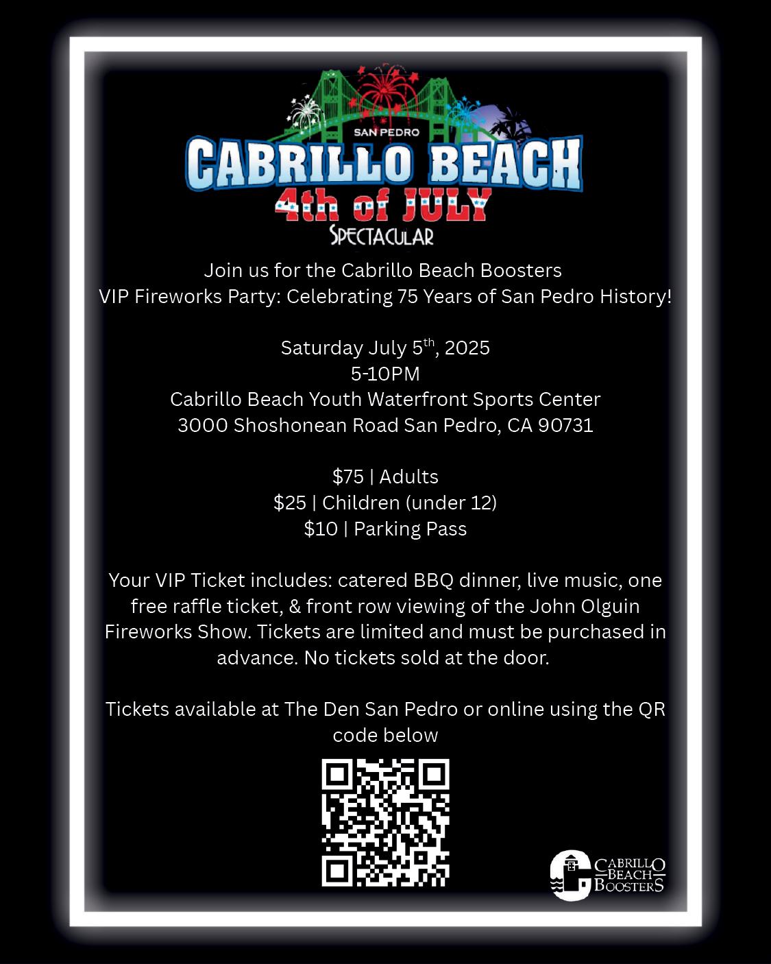 music, one free raffle ticket, and front-row viewing of the John Olguin fireworks show. Tickets are limited and must be purchased in advance. No tickets sold at the door. Adults $75; children (under 12) $25; parking pass $10. Tickets available at The Den San Pedro or at cabrillobeachboosters.com.